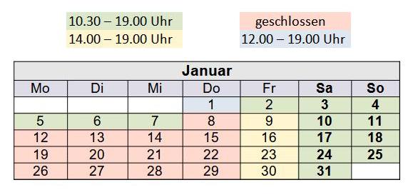 Außerhalb der Ferien am Wochenende und an Feiertagen 10:30–19:00 Uhr, freitags 14:00–19:00 Uhr. Montag–Donnerstag geschlossen.