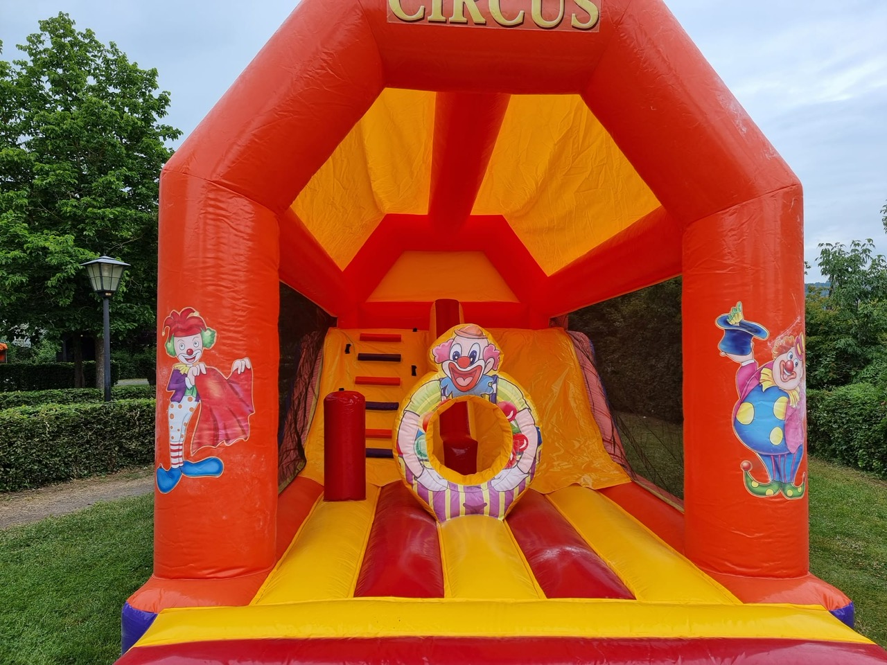 Durch ihre bunten und fröhlichen Farben ist die Hüpfburg Clown der Blickfang auf jeder Party. Der große 3D Clown auf dem Dach ist schon von Weitem zu sehen und verspricht Springspaß ohne Ende. Im Inneren erwarten die Kinder eine Springfläche und viele tolle Spielelemente sowie eine Rutsche. Große Mesh-Einsätze an den Seiten schützen hüpfende Kinder vor dem Rausfallen. Ein absoluter Partykracher!